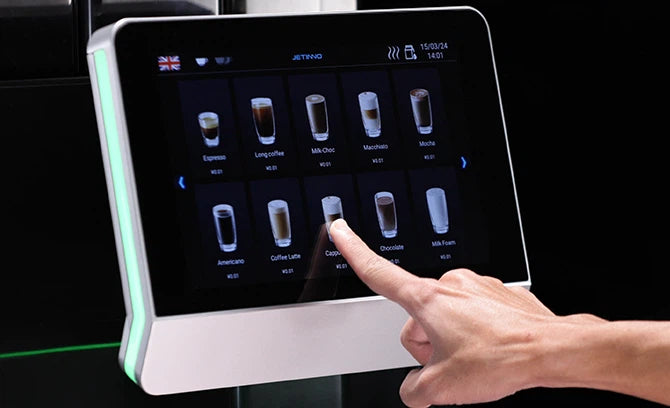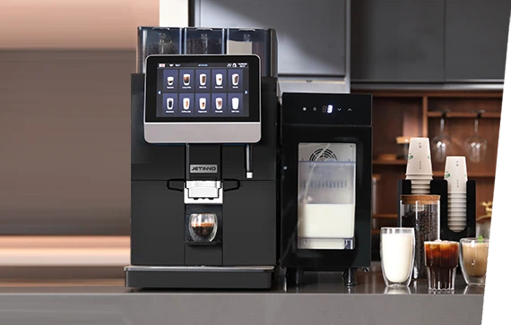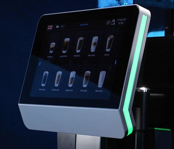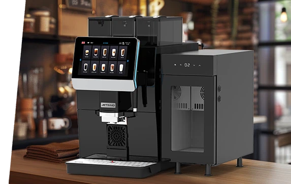 The JL33A coffee machine combines elegance and smart functionality, boasting a sleek 10.1-inch touchscreen with an intuitive interface that simplifies coffee making to a one-touch process. Enhanced by tri-color ambient lighting along the screen's edge, it not only provides a visually striking appearance but also offers barista-quality coffee with the press of a button, making it a standout choice for any commercial setting.